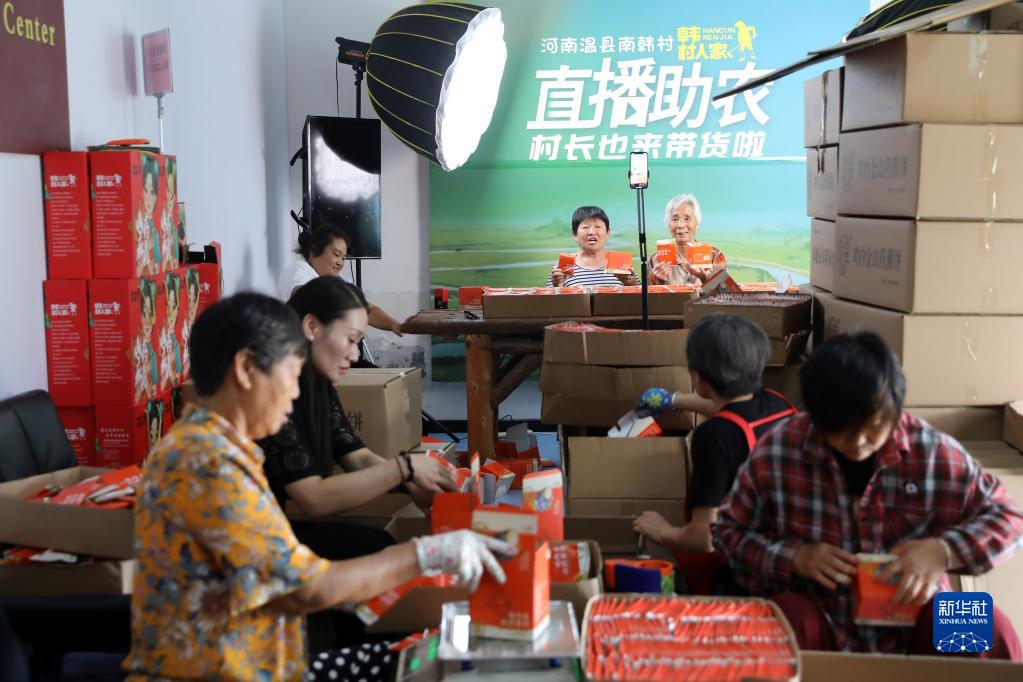 9月4日,在焦作市温县黄庄镇南韩村,村民在直播间包装当地特产。新华社