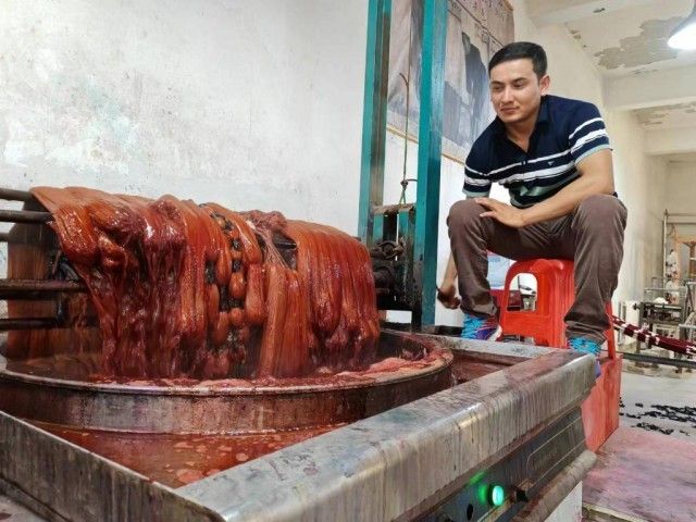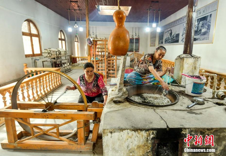 瓜果飘香时节,玉龙喀什河静静流淌,艾德莱斯村织机嗒嗒作响。在以玉石闻名的和田地区,和田市吉亚乡艾德莱斯村以当地传统丝绸“艾德莱斯”为名。 9月5日,“四季看新疆第二季”之“沿着河湖看新疆”主题采访活动采访团走进和田地区和田市吉亚乡,探访艾德莱斯丝绸的发源地。图为吉亚乡艾德莱斯村村民将蚕茧煮沸后进行抽丝,如今该村仍保留着传统的艾德莱斯丝绸制作工艺。中新网