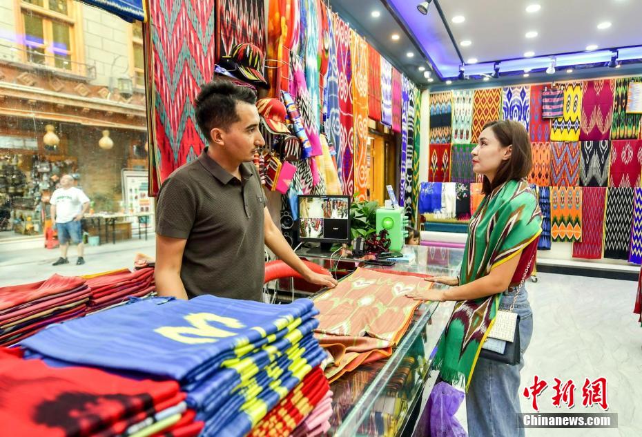 目前,吉亚乡有艾德莱斯绸生产企业7家、合作社4家,从事家庭式艾德莱斯织绸专业户668户,艾德莱斯织机765台,艾德莱斯绸产业实现从抽丝、染丝、织布到服装、实体店、网络销售完整产业链。产品远销疆内外,年产量近45万匹,年产值超3000万元。图为吉亚乡一家艾德莱斯丝绸直销点,游客正在选购艾德拉斯产品。中新网