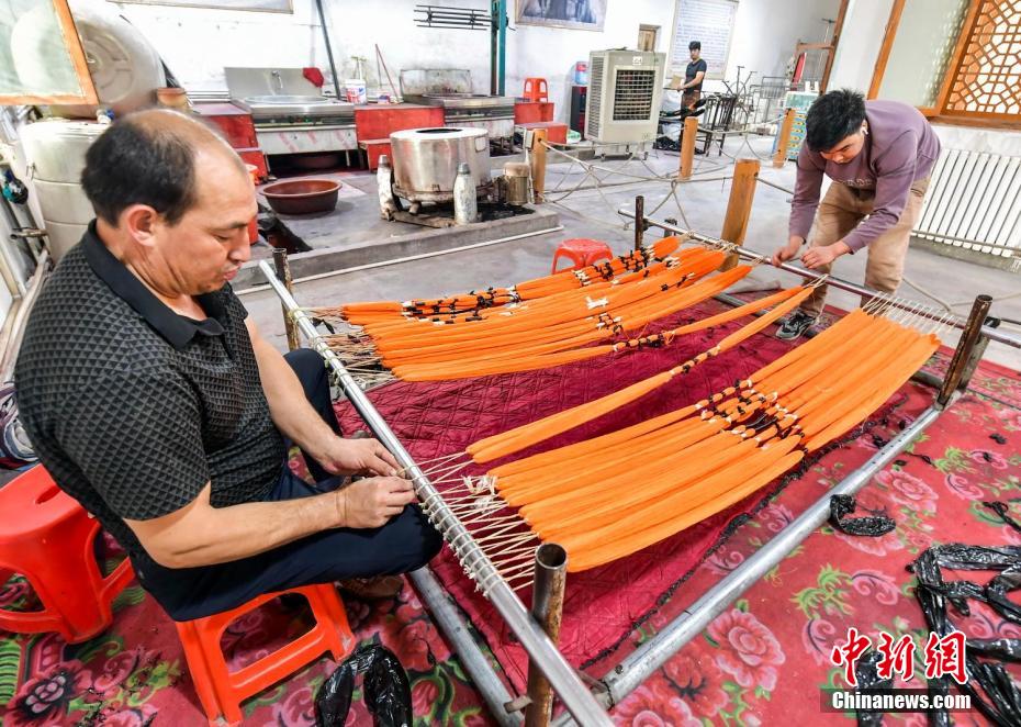 艾德莱斯作为国家级非物质文化遗产,迄今已有千余年历史,吉亚乡作为发源地,被誉为“艾德莱斯丝绸之乡”。图为吉亚乡艾德莱斯村村民按照传统的花色图案进行捆丝,方便后期染色。中新网
