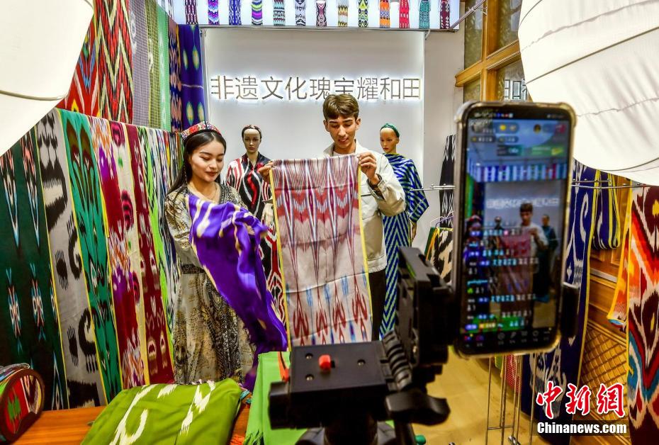 吉亚乡网络电商直播销售艾德莱斯绸。中新网