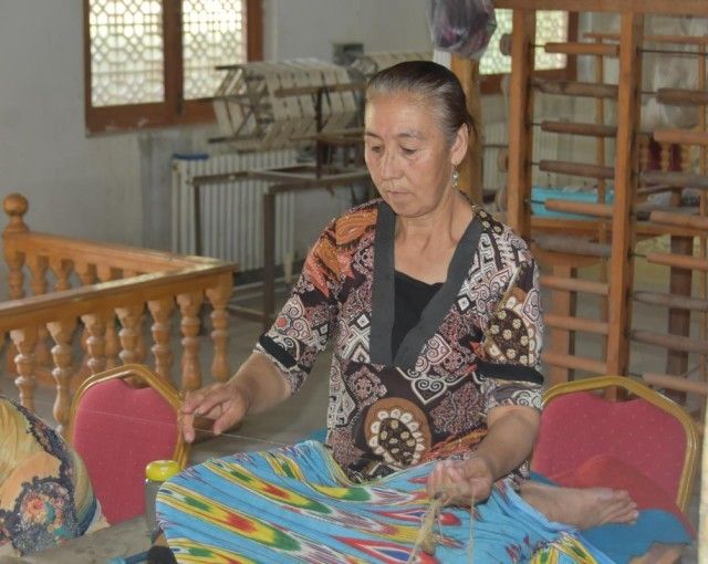 近年来,吉亚乡积极探索艾德莱斯产业链,发展桑蚕产业、纺织产业、旅游产业,辐射带动辖区群众增收致富,实现经济效益、社会效益协同发展、相辅相成的良性循环。图为吉亚乡阿孜乃巴扎村村民屯妮萨汗·图尔荪在家中熟练操作织机,编制艾德莱斯丝绸,目前她家共有3台织机。中新网