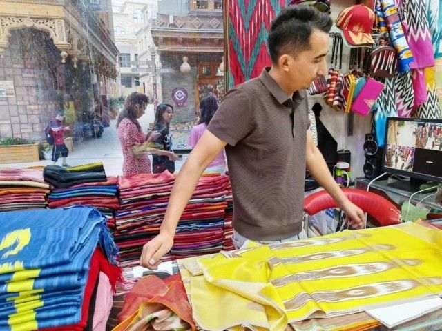 9月4日,新疆和田地区和田市团城景区商户展示艾德莱斯丝绸面料。新华社