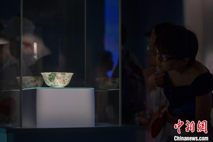 9月7日,由广东省博物馆、澳门博物馆和香港艺术馆联合策划的巡回展览“三城记——明清时期的粤港澳湾区与丝绸外销”在香港艺术馆举行新闻界预展。图为参与者观赏清朝亁隆年间的粉彩描金耕织图花口碗。
