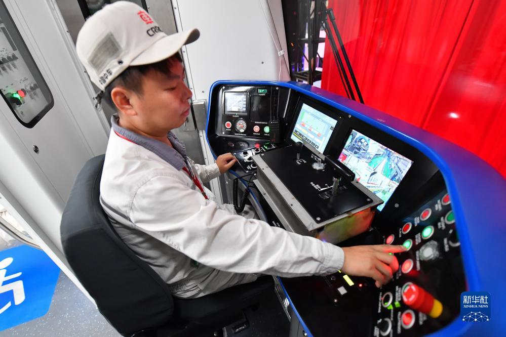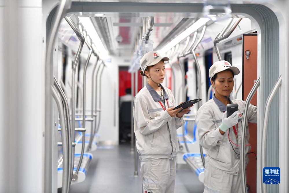 9月9日,中国中车为墨西哥首都墨西哥城定制的铰接式轻轨列车首列车在中车株机公司下线。这是“中国造”轻轨列车首次服务墨西哥城。中墨双方有关人员通过视频连线见证列车下线。图为中车株机公司工作人员在中国中车出口墨西哥城轻轨列车首列车内进行巡检(9月9日摄)。新华社