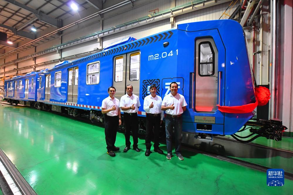 墨西哥宾客在中国中车出口墨西哥城轻轨列车首列车旁合影。新华社