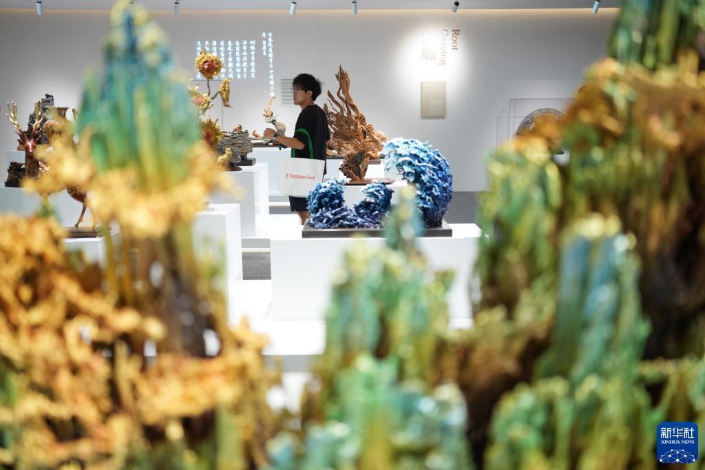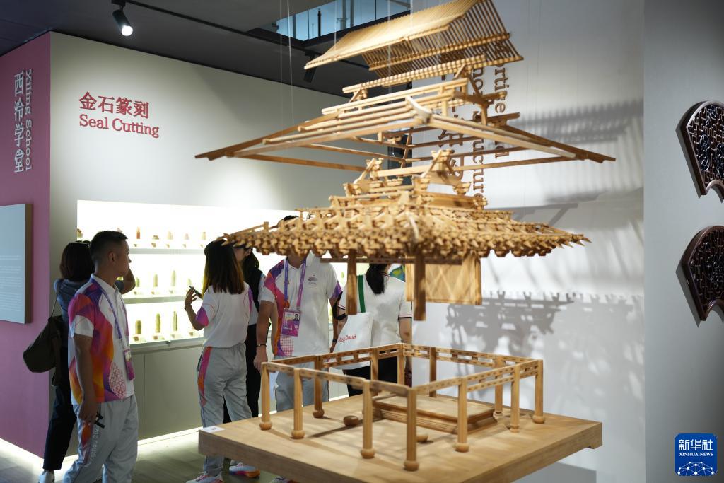 9月12日,媒体记者参观亚运村内展示的金石篆刻和榫卯结构展品。新华社