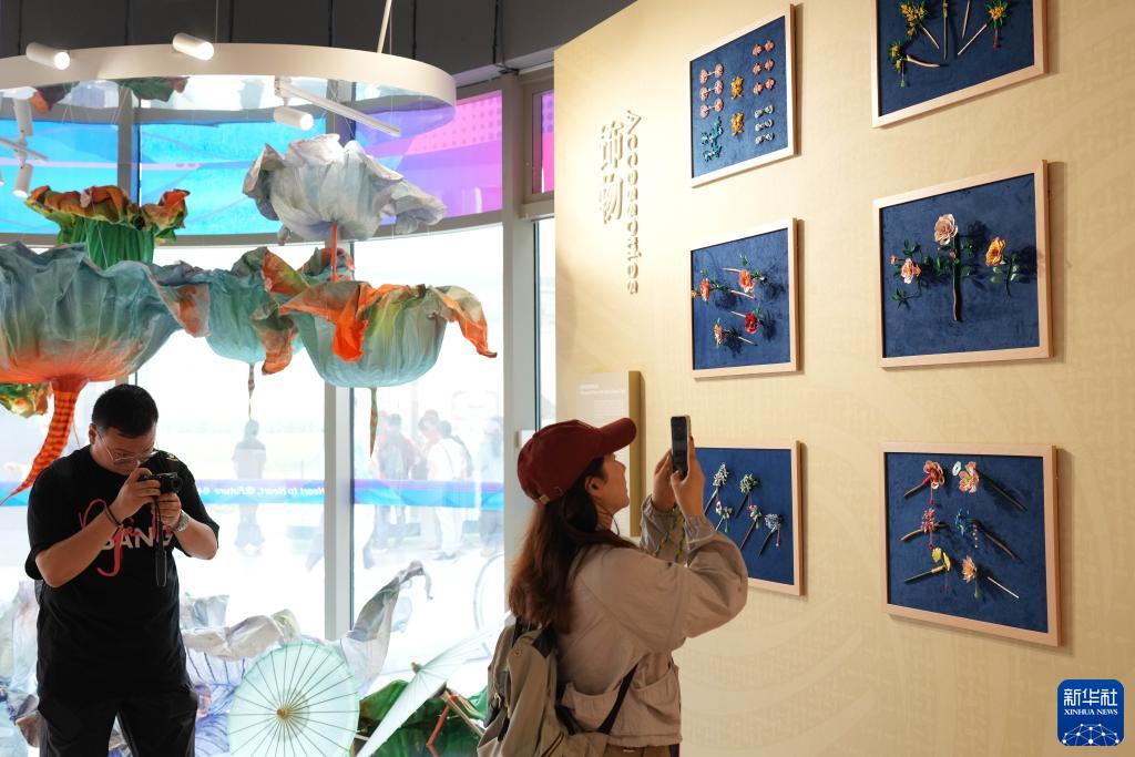 9月12日,媒体记者在参观亚运村内展示的江南特色的饰物。新华社