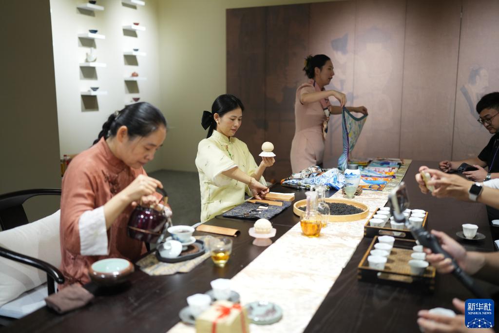 9月12日,工作人员在亚运村内展示茶艺、茶点、丝绸。新华社