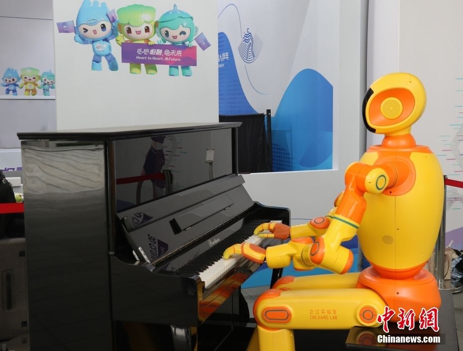 村中,智能应用场景随处可见、吸引眼球。图为9月12日,钢琴机器人在杭州亚运村内弹奏乐曲。中新网
