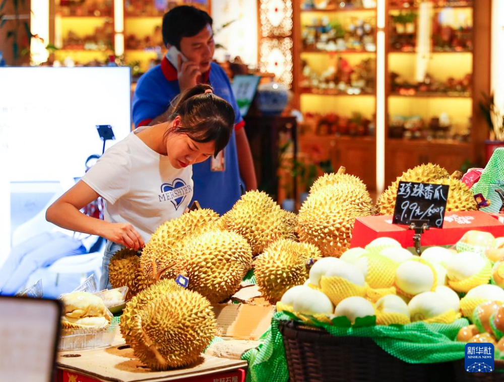 目前有越南、泰国、柬埔寨、老挝、缅甸、马来西亚共6个东盟国家在南宁设立了总领事馆,广西与东盟国家缔结了59对友城,为中国最多。图为9月7日,市民在广西南宁一家超市选购泰国榴莲。新华社