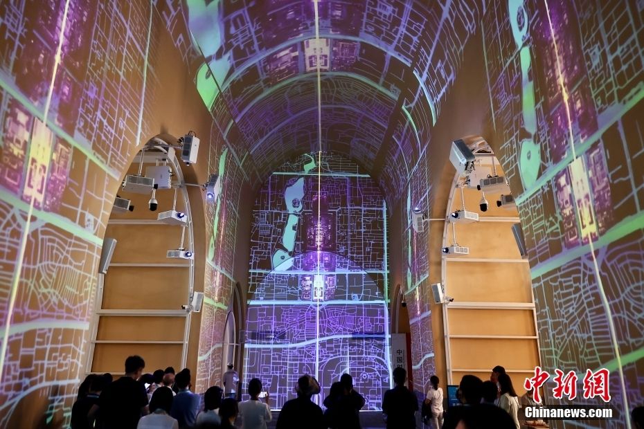 14日,参加2023北京文化论坛的嘉宾参观北京中轴线。图为论坛嘉宾在鼓楼参观数字沉浸展“时间的故事”。中新网