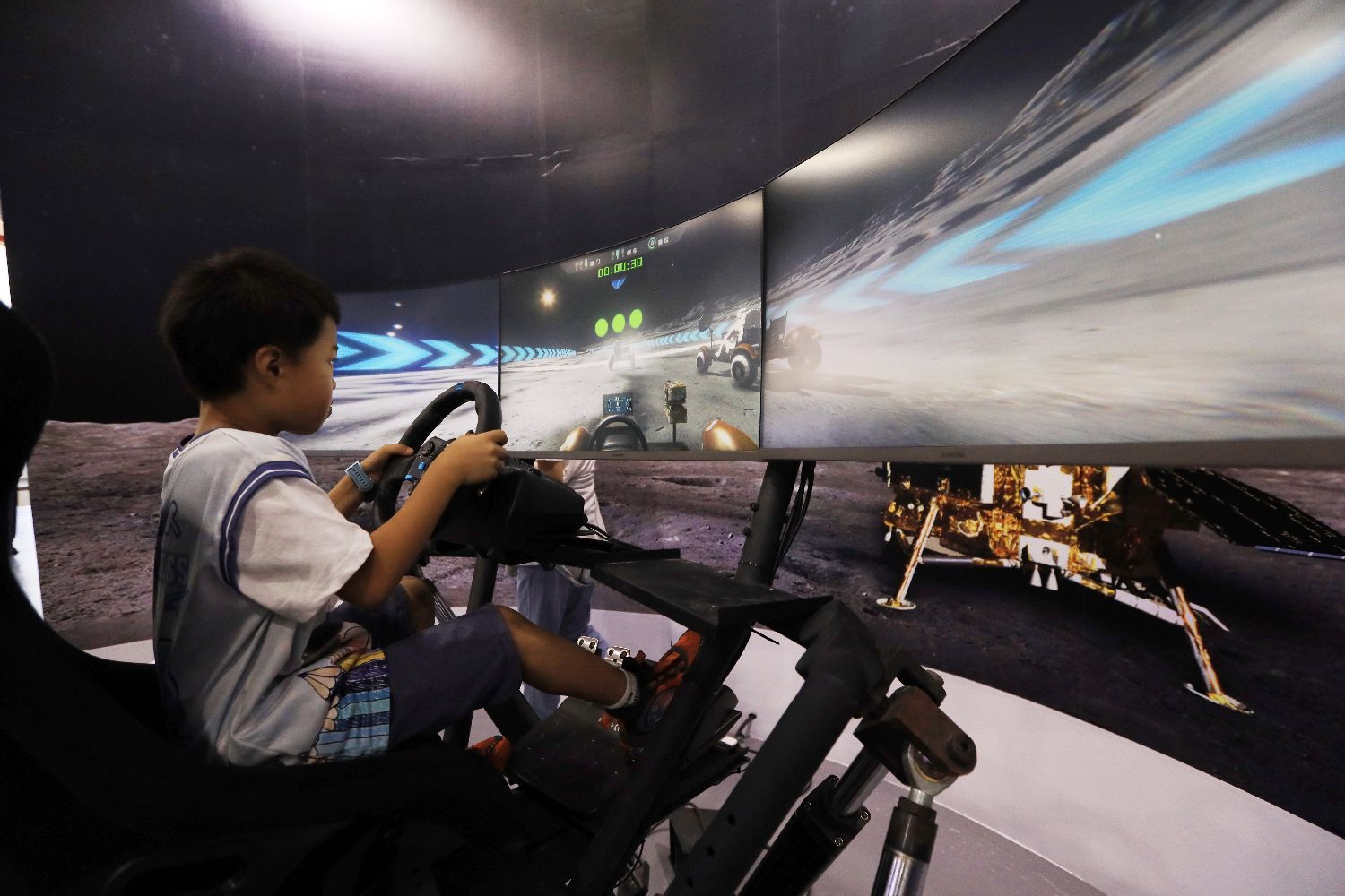 9月16日,一名小朋友在活动现场体验“月地驾驶”。卞程宣 摄