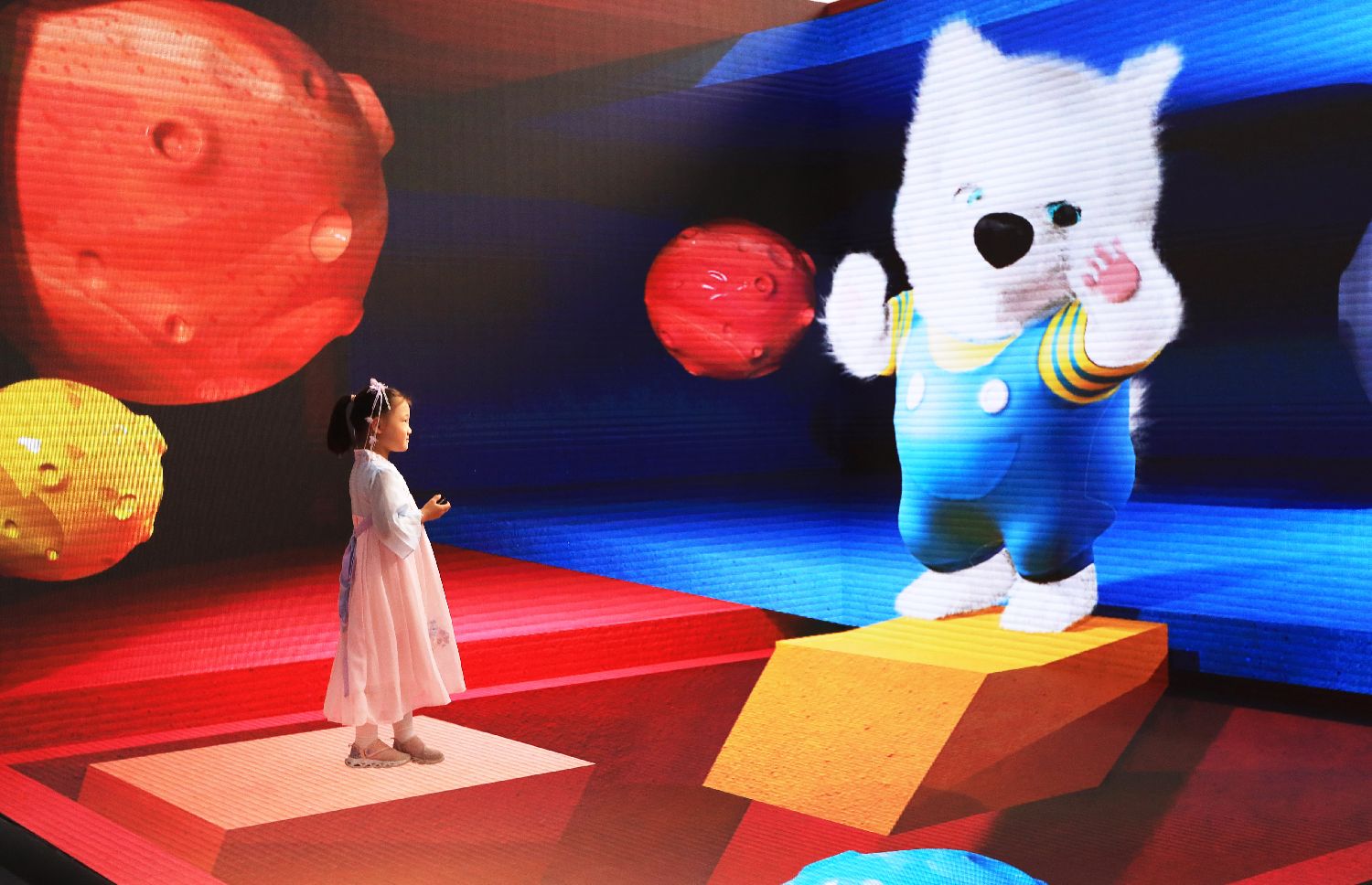 9月16日,活动现场,一名小女孩在与虚拟宠物进行实时互动。 卞程宣 摄