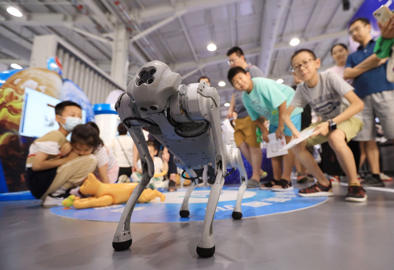 9月16日,一条AI机器狗在活动现场与小朋友互动。 卞程宣 摄