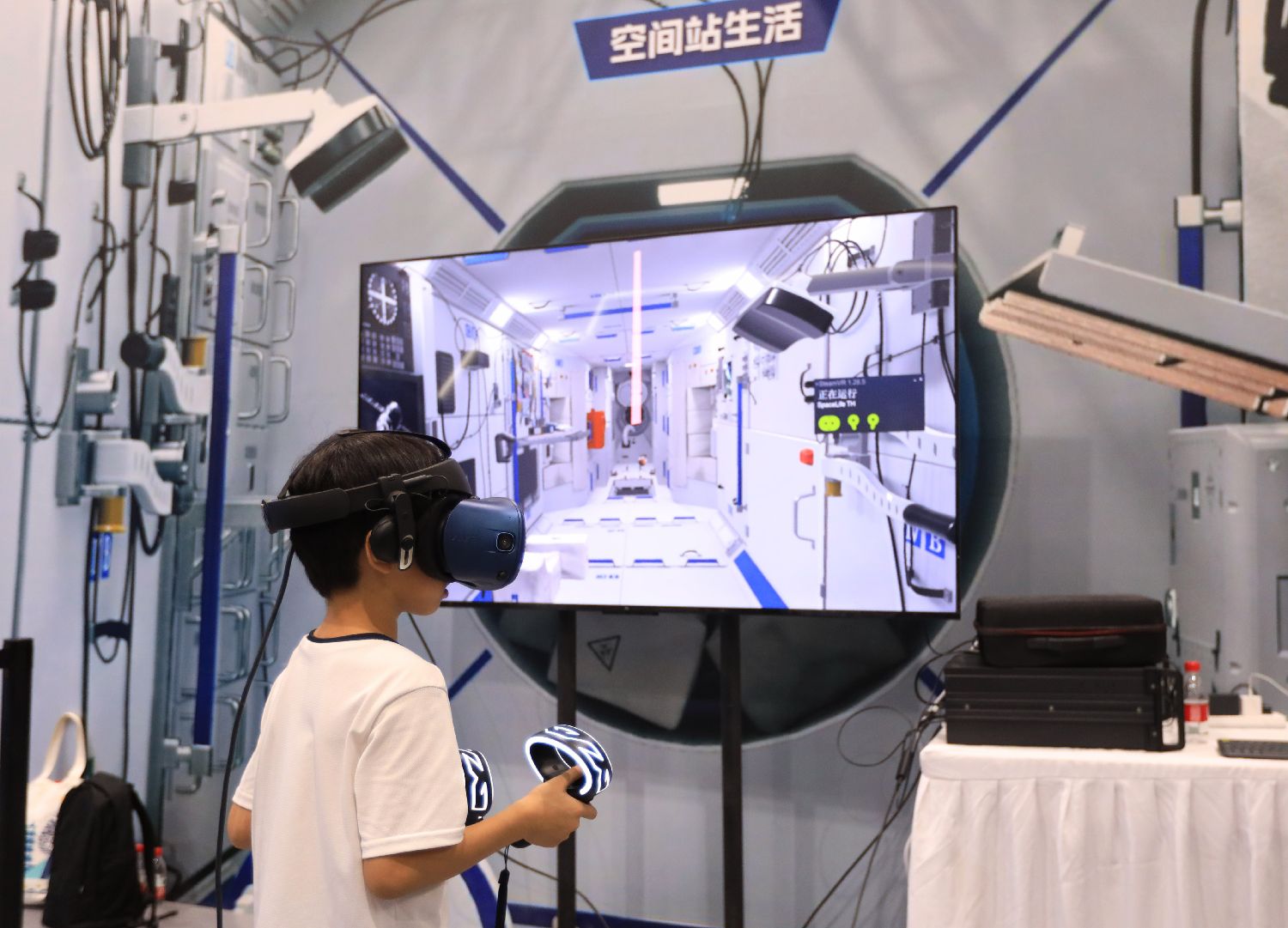 9月16日,一位小朋友佩戴VR眼镜“走进”中国空间站。 卞程宣 摄