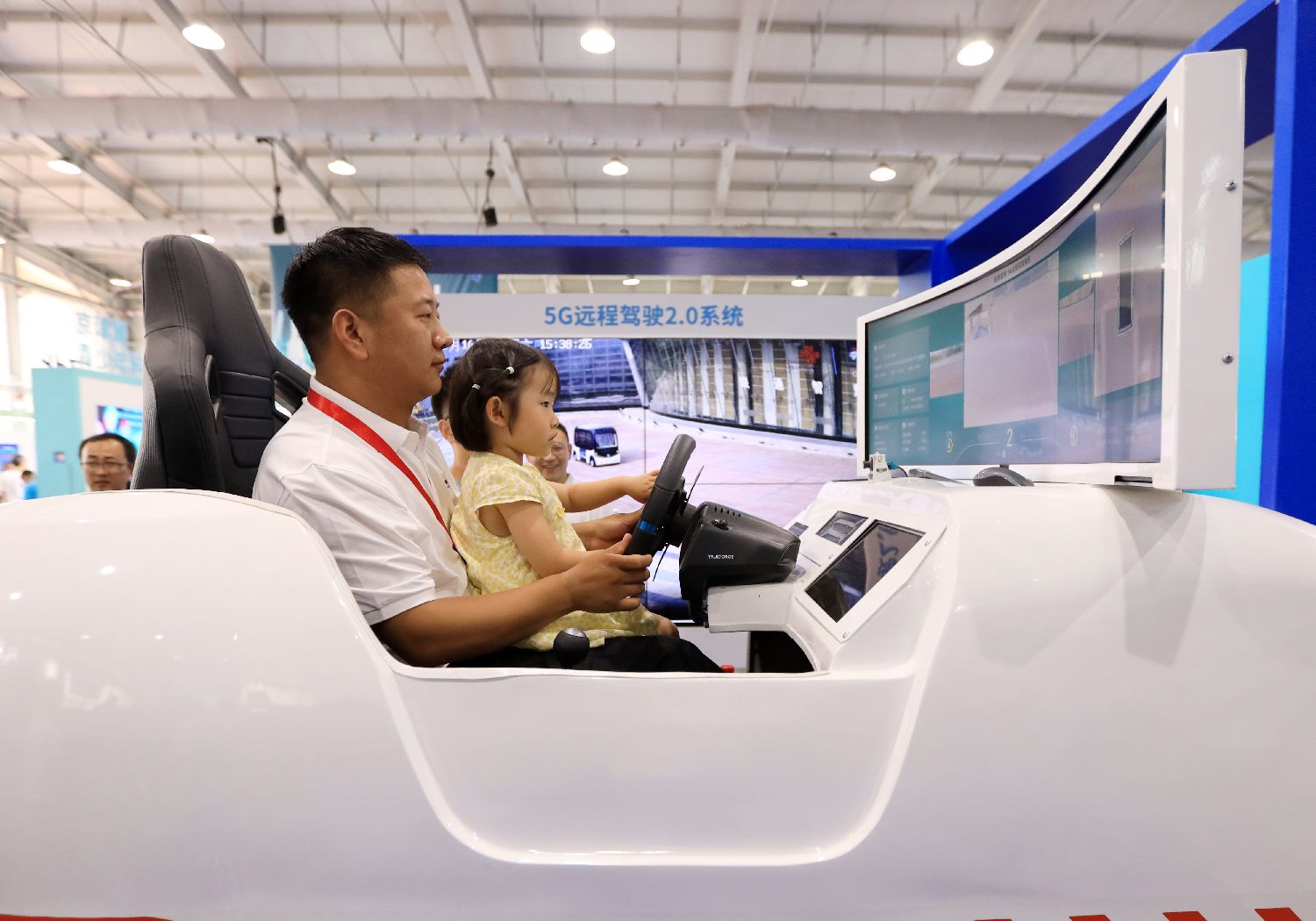 9月16日,在智能交通展区,观众通过“5G远程驾驶2.0系统”远程操控着一辆无人驾驶车。 卞程宣 摄