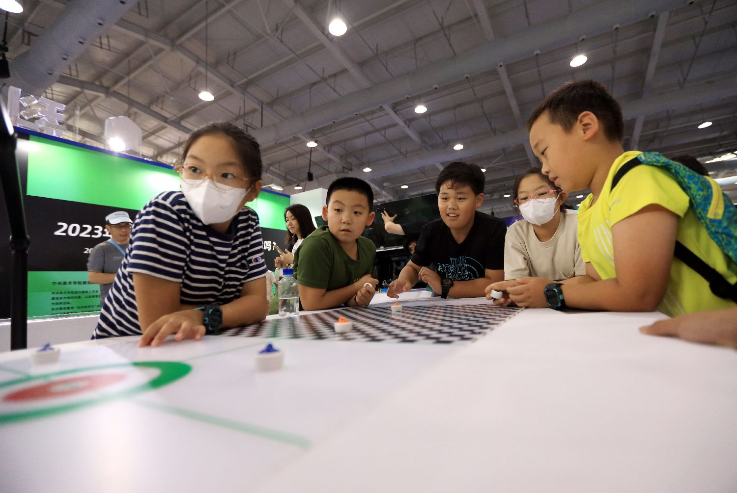 9月16日,一群小朋友在活动现场体验桌上冰壶比赛智能鹰眼系统。 卞程宣 摄