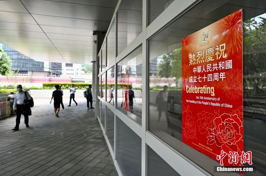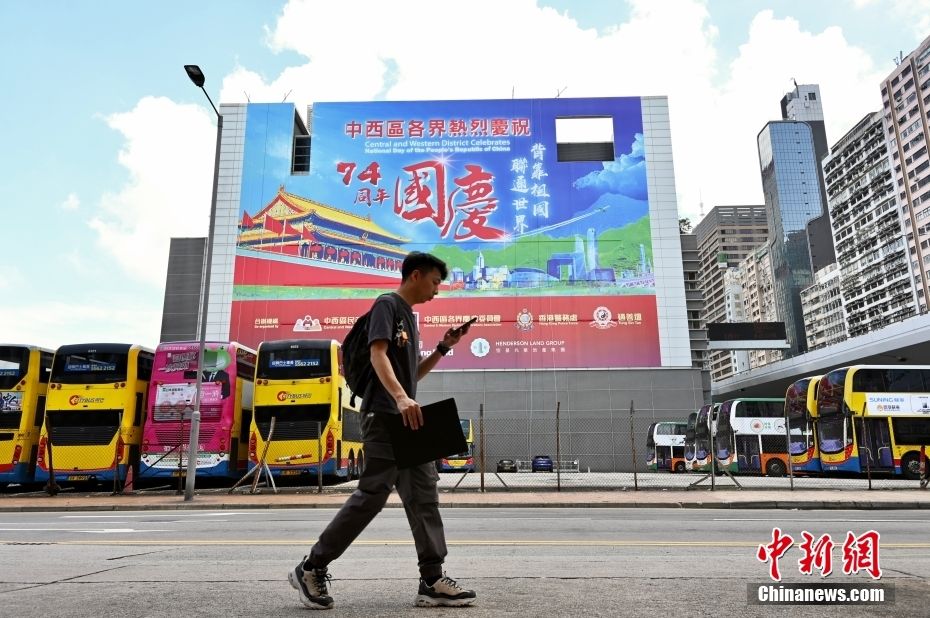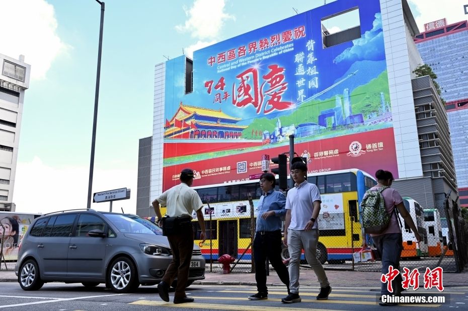 临近中国国庆,香港街头有建筑物出现庆国庆的巨幅海报或横幅,气氛浓厚。