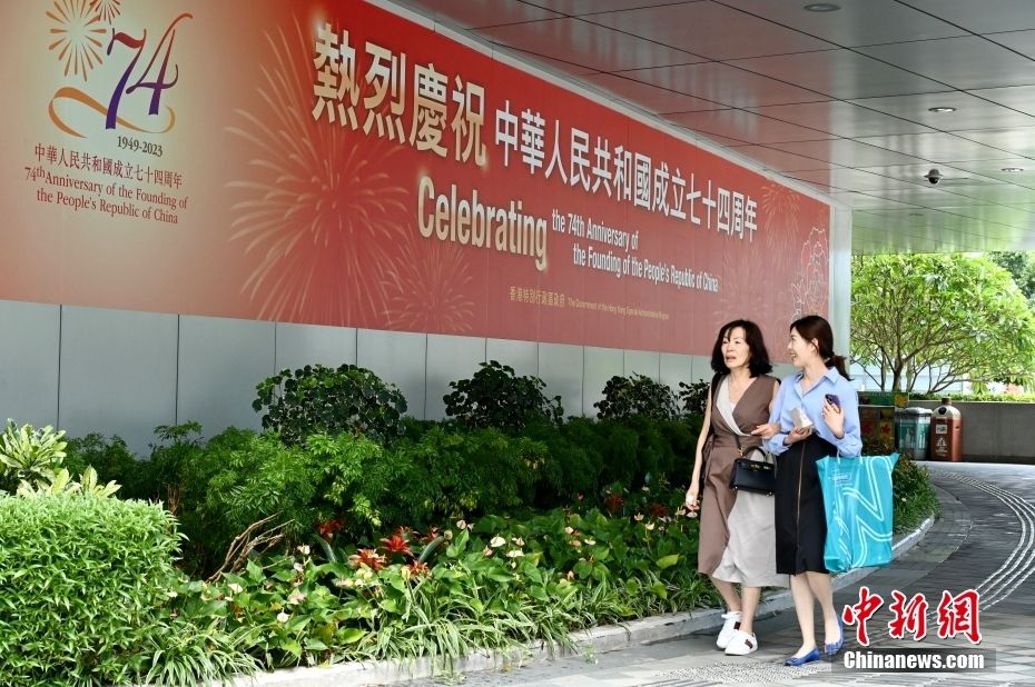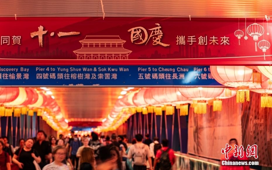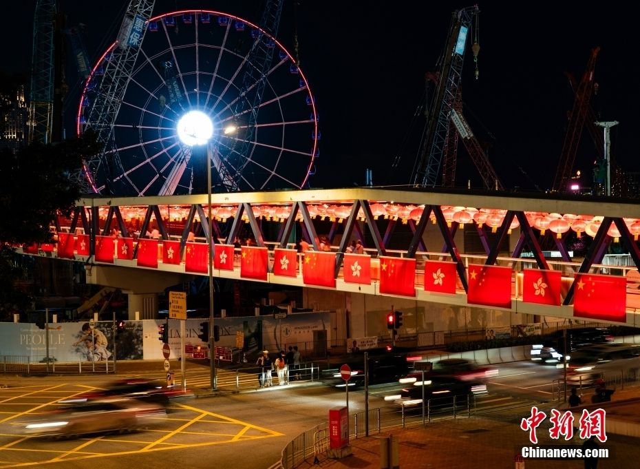 9月19日,香港特别行政区中环天桥悬挂中国国旗和特区区旗,并布置有喜庆的红灯笼等饰物,准备迎接中华人民共和国成立七十四周年。