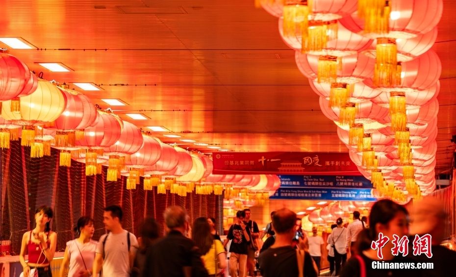 9月19日,香港特别行政区中环天桥布置有喜庆的红灯笼等饰物,准备迎接中华人民共和国成立七十四周年。