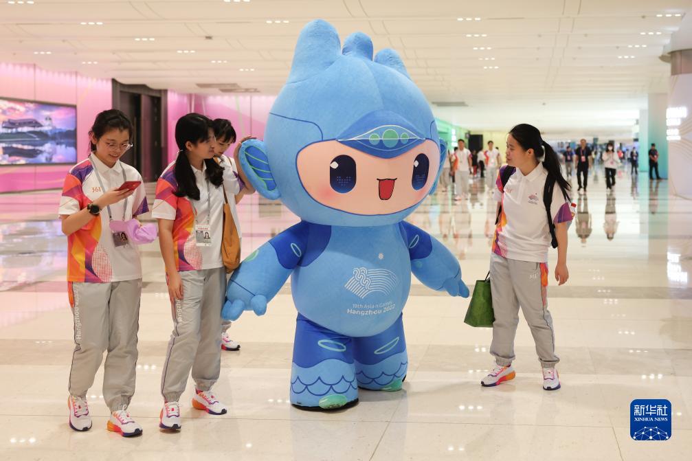 9月18日,在杭州亚运会主媒体中心,吉祥物宸宸和工作人员在一起。新华社