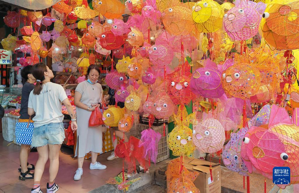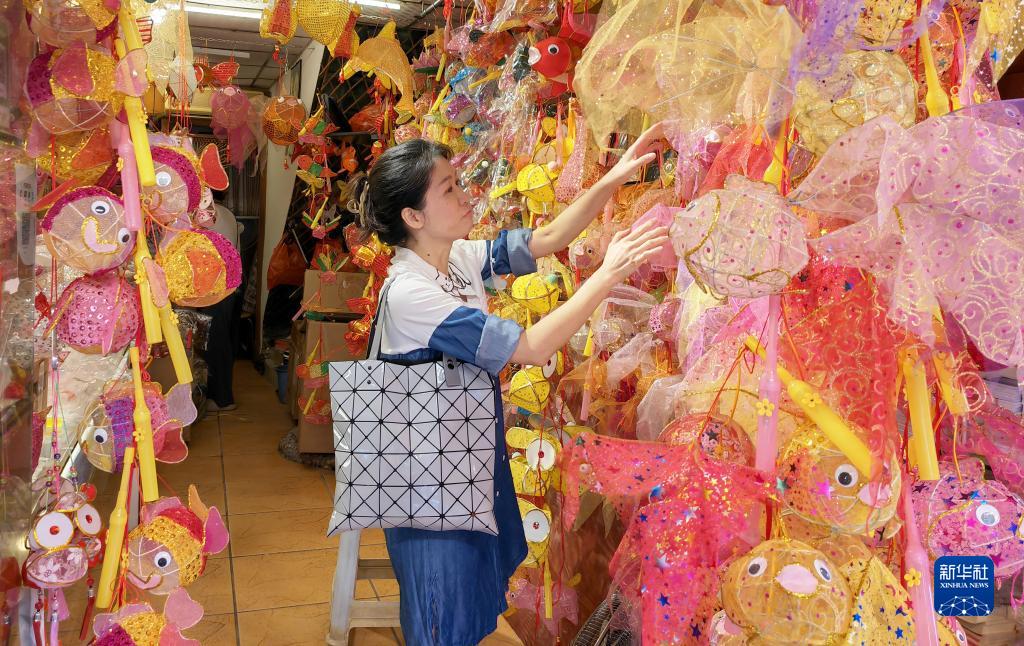 随着中国传统节日中秋节日益临近,中国各地节日氛围浓厚,做月饼、赏花灯……营造出喜庆、热烈的节日氛围。人们也从丰富多彩的活动中了解中国传统习俗,用不同方式感受节日魅力。图为9月25日,游客在广州市光孝路选购手工灯笼。新华社