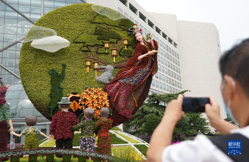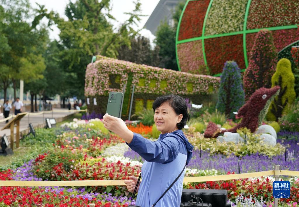 中秋节假期日益临近,北京天安门广场的“祝福祖国”巨型花篮及长安街沿线立体花坛精彩亮相,吸引游人及市民观赏留念。图为9月25日,游客在北京西单一处花坛前拍照。新华社