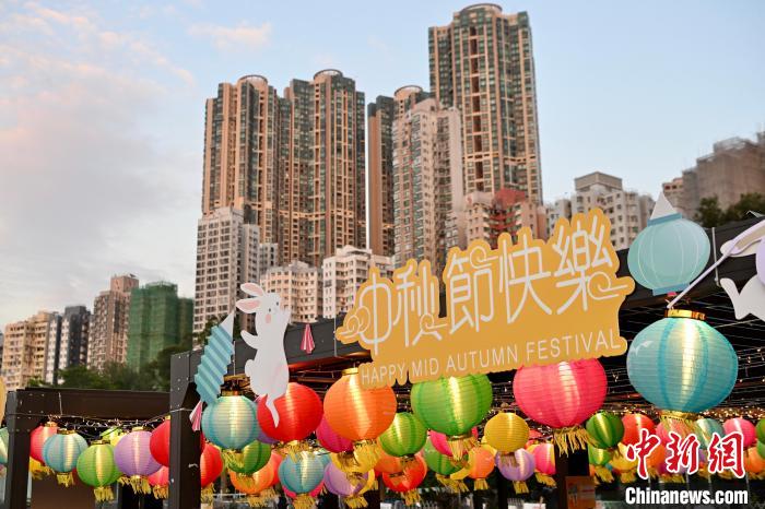 9月25日,临近中秋节,香港坚尼地城海滨长廊布置起传统灯笼及逾百只兔子造型的灯笼迎接中秋节,吸引大批游客拍照留念。中新网