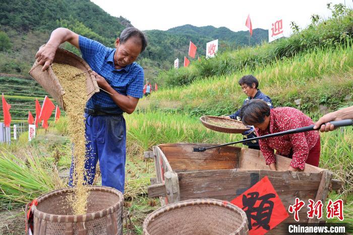 9月24日,安徽省黄山市歙县三阳镇白石源村组织开展群众庆丰收、游客参与互动等活动,通过割稻比赛、集卡游戏、乡野音乐会等趣味比赛,喜迎节日的到来。中新网