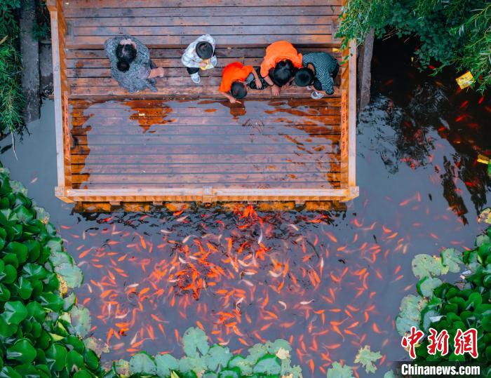 位于太子山附近的村庄,也打造出“网红项目”,图为游客在太子山天池喂鱼。中新网