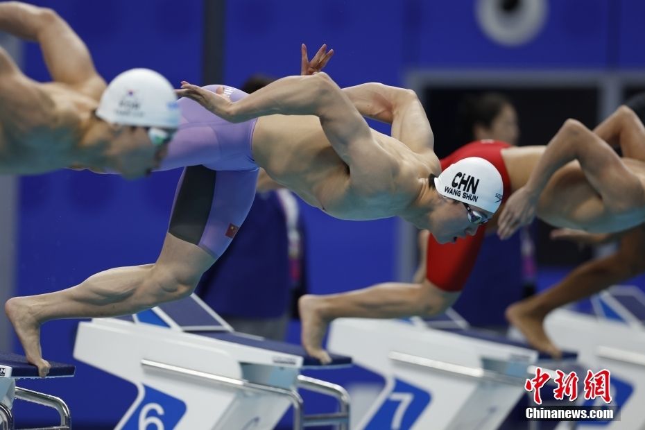 9月25日,杭州第19届亚运会男子4x200米自由泳接力决赛在杭州奥体中心游泳馆举行。中国选手汪顺、牛广盛、王浩宇、潘展乐以7分03秒40获得亚军。图为汪顺出发。中新网