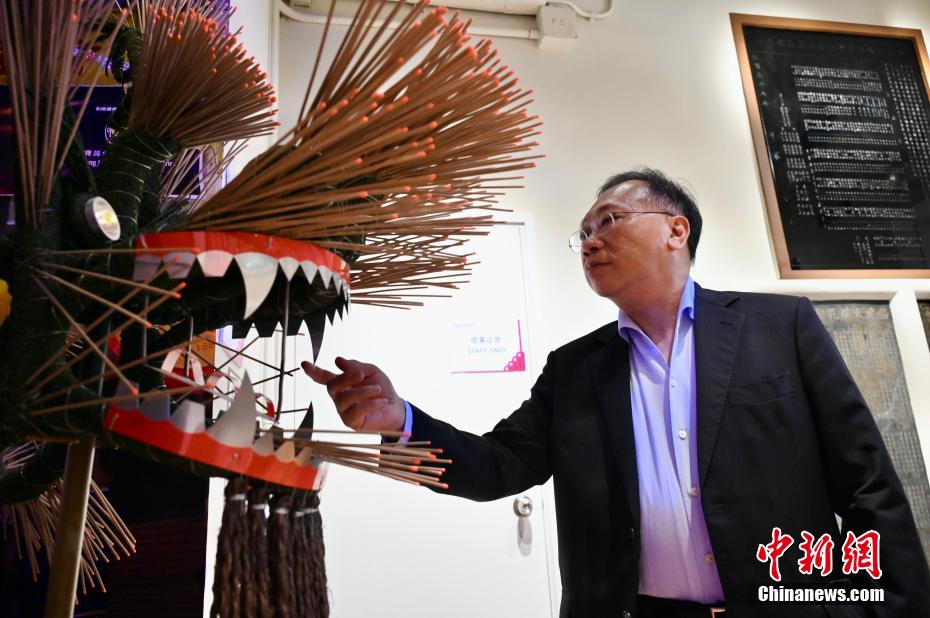 大坑火龙文化馆理事会理事长、香港特区立法会议员林筱鲁介绍,舞火龙的习俗来源于一个传说:相传百年前大坑区曾暴发一场瘟疫。彼时,居民为驱赶灾害病痛,就在中秋佳节期间以珍珠草织成长龙,在龙身上插满线香,一边燃放鞭炮,一边舞动火龙,三天三夜后,灾祸绝迹。自此,这项活动成为香港延续至今的一项重要传统习俗。每年用藤枝新扎的火龙,由龙头、龙尾及31节龙身屈成,龙身下接竹竿,再用铁线于藤架及绳缆上扎上一层厚厚的珍珠草,以便在其身上插紧45厘米的1.2万根长寿线香,并巡游在浣纱街、铜锣湾道等一带。图为大坑火龙文化馆理事会理事长、香港特区立法会议员林筱鲁与大坑火龙文化馆中展示的火龙展品。中新网