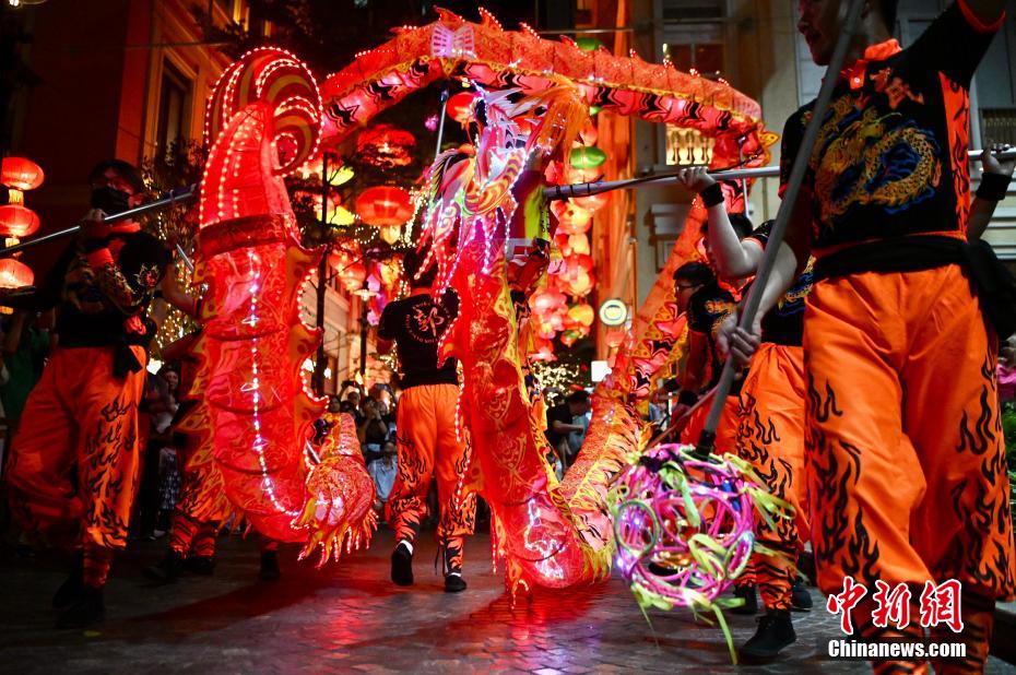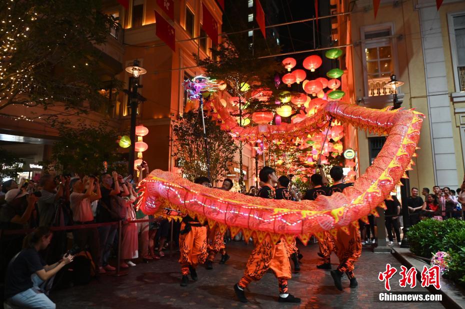 今年香港复办舞火龙这项传统习俗,大坑及薄扶林村坊众相继舞动熠熠生辉的火龙,穿梭于大街小巷,锣鼓喧天,吸引市民及游客到来参与盛会,热闹非凡。位于湾仔利东街也有别开生面的LED火龙表演,团队在五彩缤纷的传统灯笼下舞动LED火龙,更显亮丽,这是结合传统、艺术与科技的发展。图为香港薄扶林村复办舞火龙盛会,坊众舞动火龙于薄扶林村内逐家逐户为居民祈福。中新网
