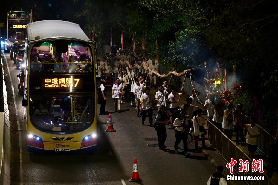 香港薄扶林村舞火龙盛会与往来的巴士。中新网
