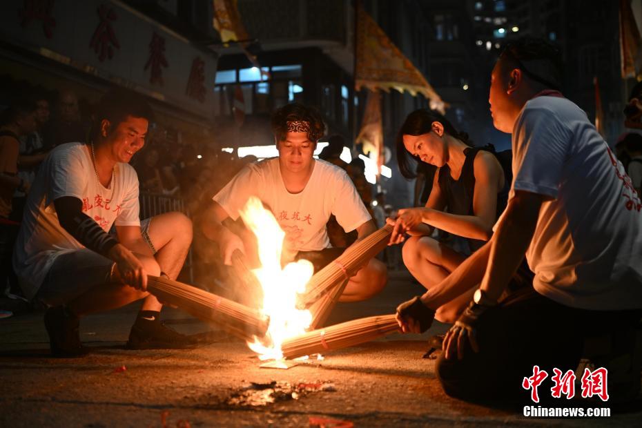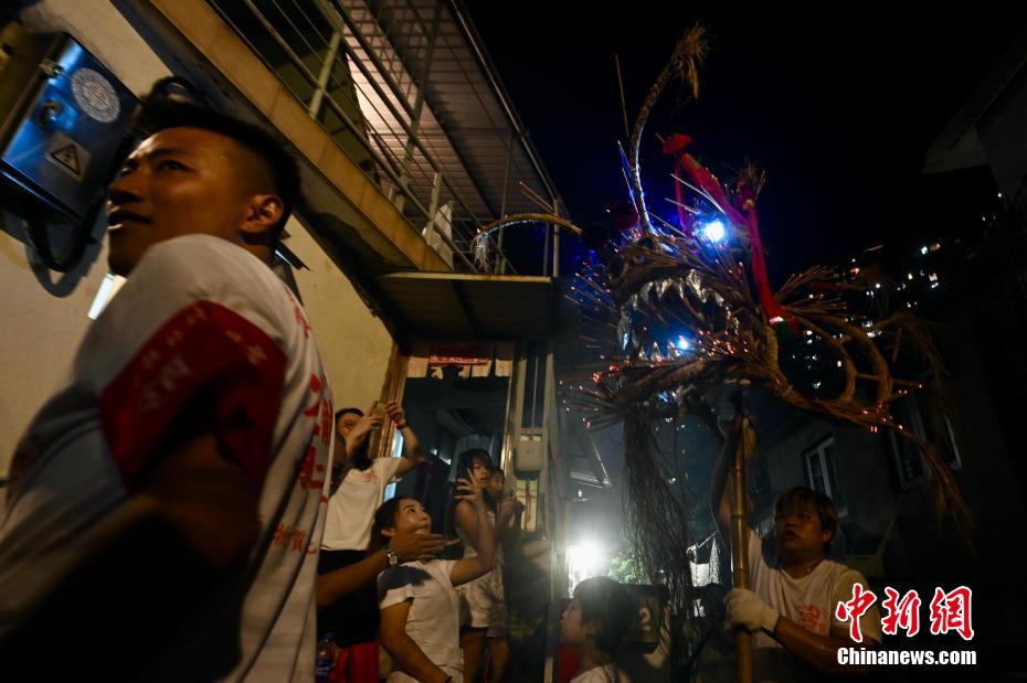 香港薄扶林村复办舞火龙盛会,坊众与游客合力为火龙插上香枝,一起体验传统文化乐趣。中新网