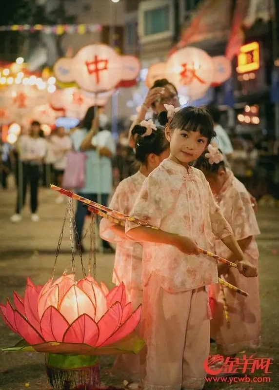 孩子们在舞火龙盛会上提着灯笼玩耍。金羊网