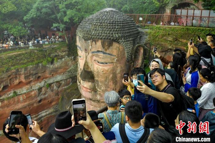 10月2日,中国中秋国庆“双节”假期第4天,四川省乐山大佛景区持续火爆,游人如织。9月29日至10月2日16时,景区已接待海内外游客16.25万人次。图为游客在观景平台上拍照留影。中新网
