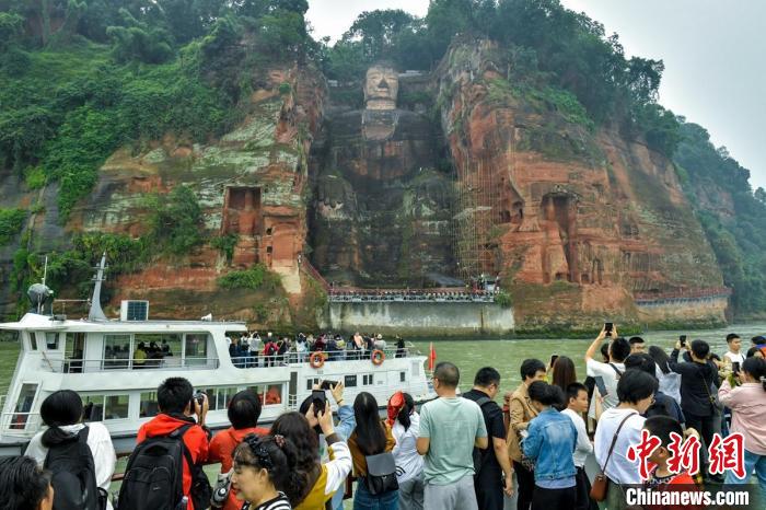 许多游客选择乘船观赏乐山大佛全貌。中新网