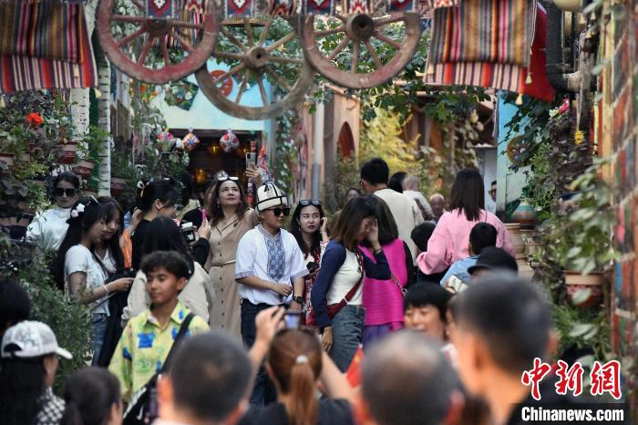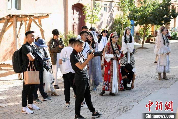 中国西部的新疆喀什古城景区近日也迎来旅游高峰,成为众多游客的出行首选,喀什古城景区每天游客量预计超过5万人次。图为在喀什古城景区里一处网红打卡点,摄影师和旅拍的游客正在排队拍照。中新网