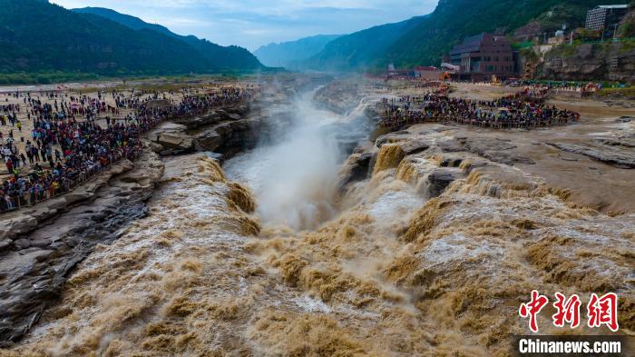 “双节”假期,位于秦晋峡谷的黄河壶口瀑布水流持续上涨,滔滔黄河水涌至秦晋峡谷,跃进壶底,出现浊浪滔天、金流飞瀑景观,吸引大量游客拍照留念。图为黄河壶口瀑布聚集众多游客参观游览。中新网