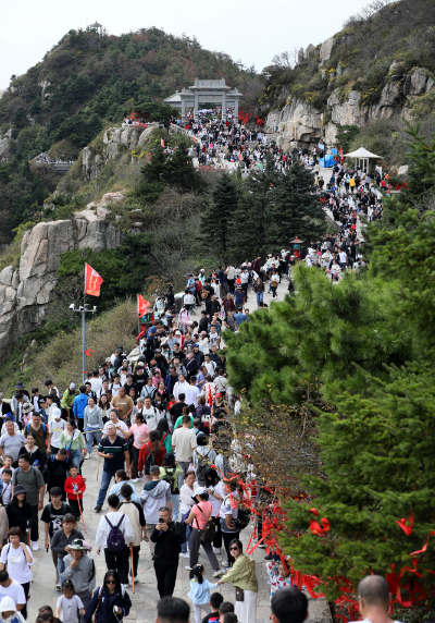 据山东泰山景区数据统计,中国中秋、国庆假日第一天9月29日0到24时,泰山景区接待进山游客3.75万人次,同比增长484.66%。当日清晨,近2万名游客在岱顶观日出,泰山再次迎来客流高峰。新华网/泰安市文化和旅游局供图