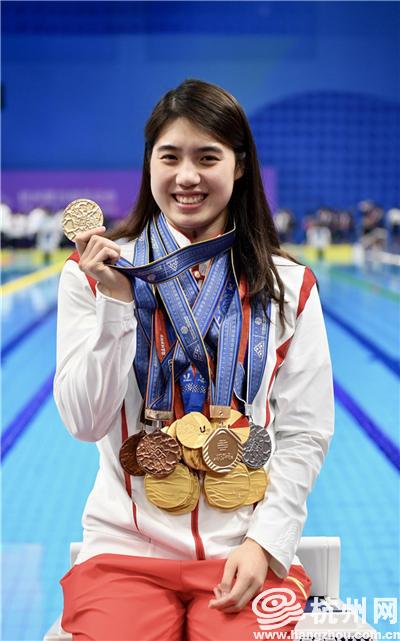 9月29日晚,杭州第19届亚运会游泳比赛落下帷幕,张雨霏展示其在福冈游泳世锦赛、第31届世界大学生夏季运动会以及杭州第19届亚运会获得的奖牌。网友:张雨霏来批发金牌了。杭州网