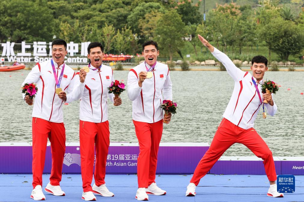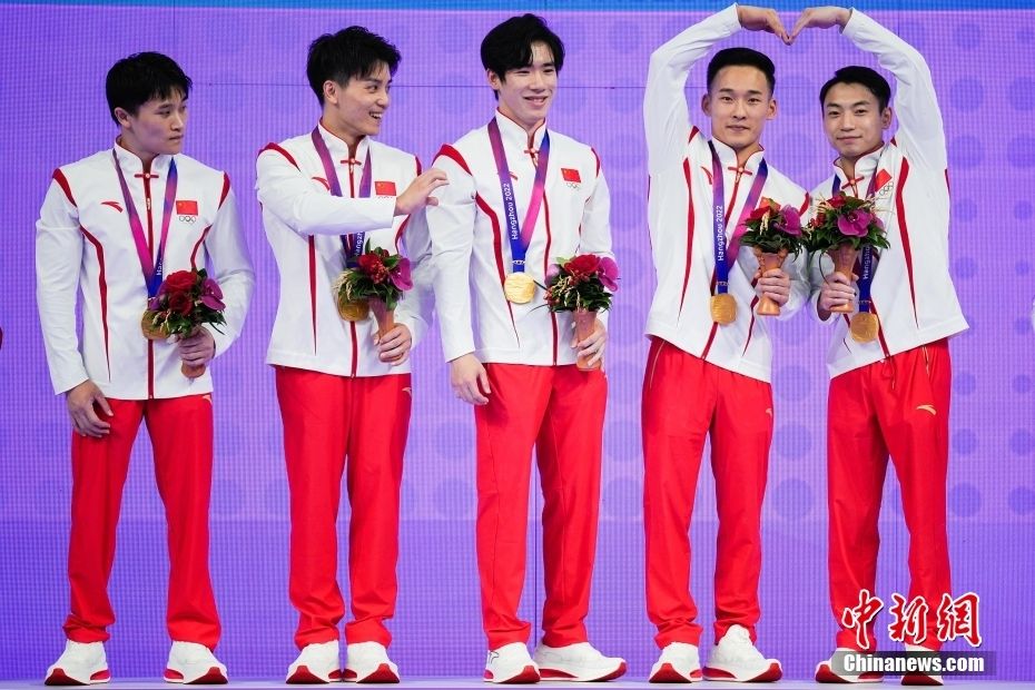 9月24日,浙江杭州,杭州亚运会体操男子资格赛暨团体决赛,中国队夺得冠军。邹敬园肖若腾合体比心,一旁的林超攀看到也举起了一只手,可惜只有“半颗心”。中新网