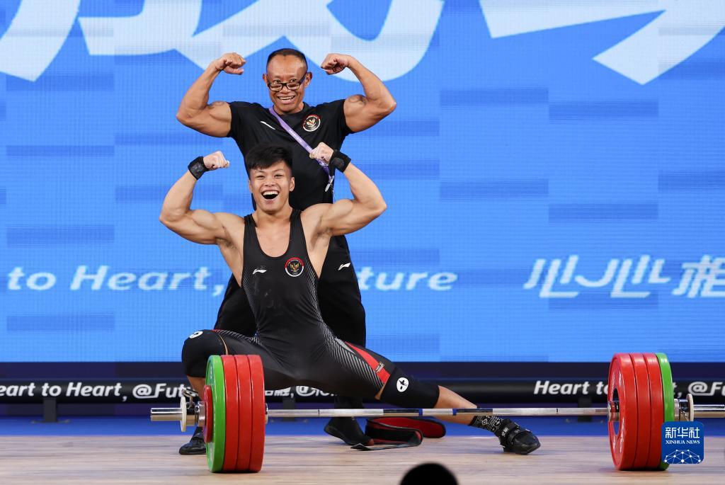 10月3日,冠军印度尼西亚选手拉赫马特·欧文·阿卜杜拉(前)获胜后庆祝。新华社