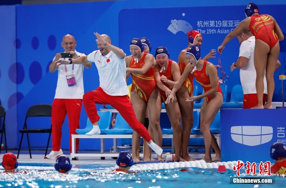 10月1日,杭州第19届亚运会女子水球决赛在杭州黄龙体育中心游跳馆举行,中国队24比11战胜日本队夺得冠军。图为中国队教练跳水庆祝。中新网