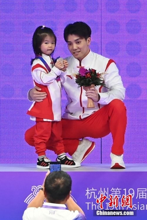 9月29日,杭州第19届亚运会竞技体操男子单杠决赛在黄龙体育中心体育馆举行,中国选手林超攀获得银牌。图为林超攀的女儿拿起爸爸的奖牌。中新网
