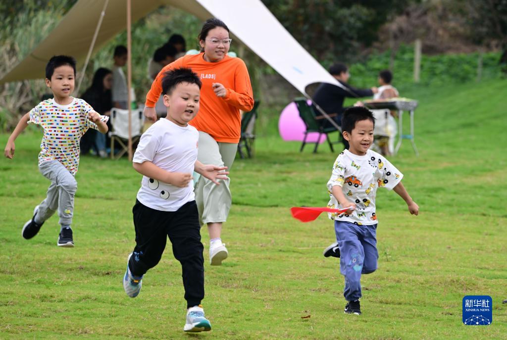 10月3日,小朋友在江苏省淮安市金湖县吕良镇三园村一处农庄追逐玩耍。新华社