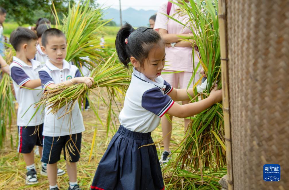 10月2日,在福建省武夷山市下梅村,小朋友在体验手工打谷。新华社