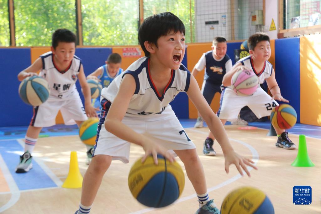 10月2日,孩子们在山东省高密市一篮球训练营进行篮球基本功训练。新华社
